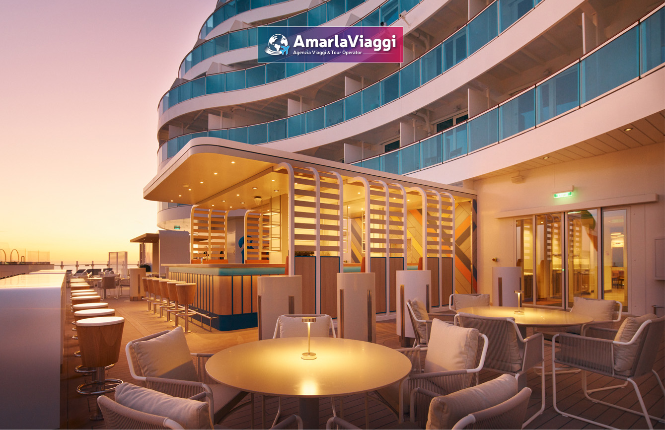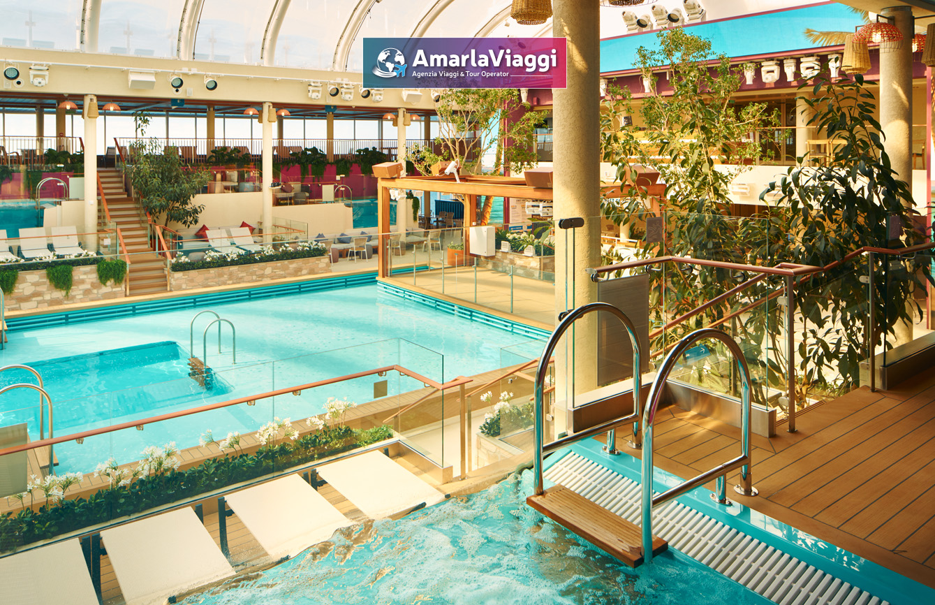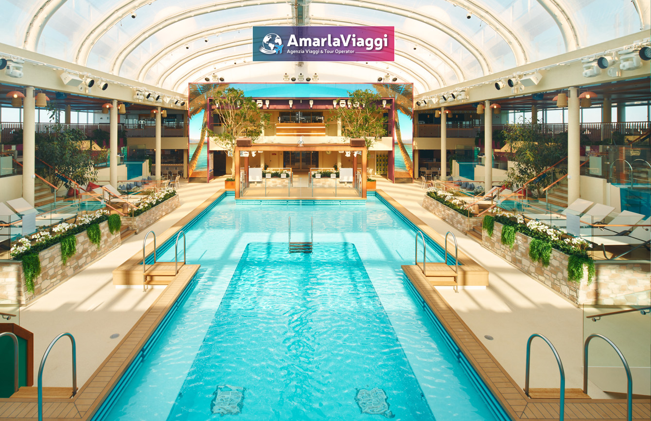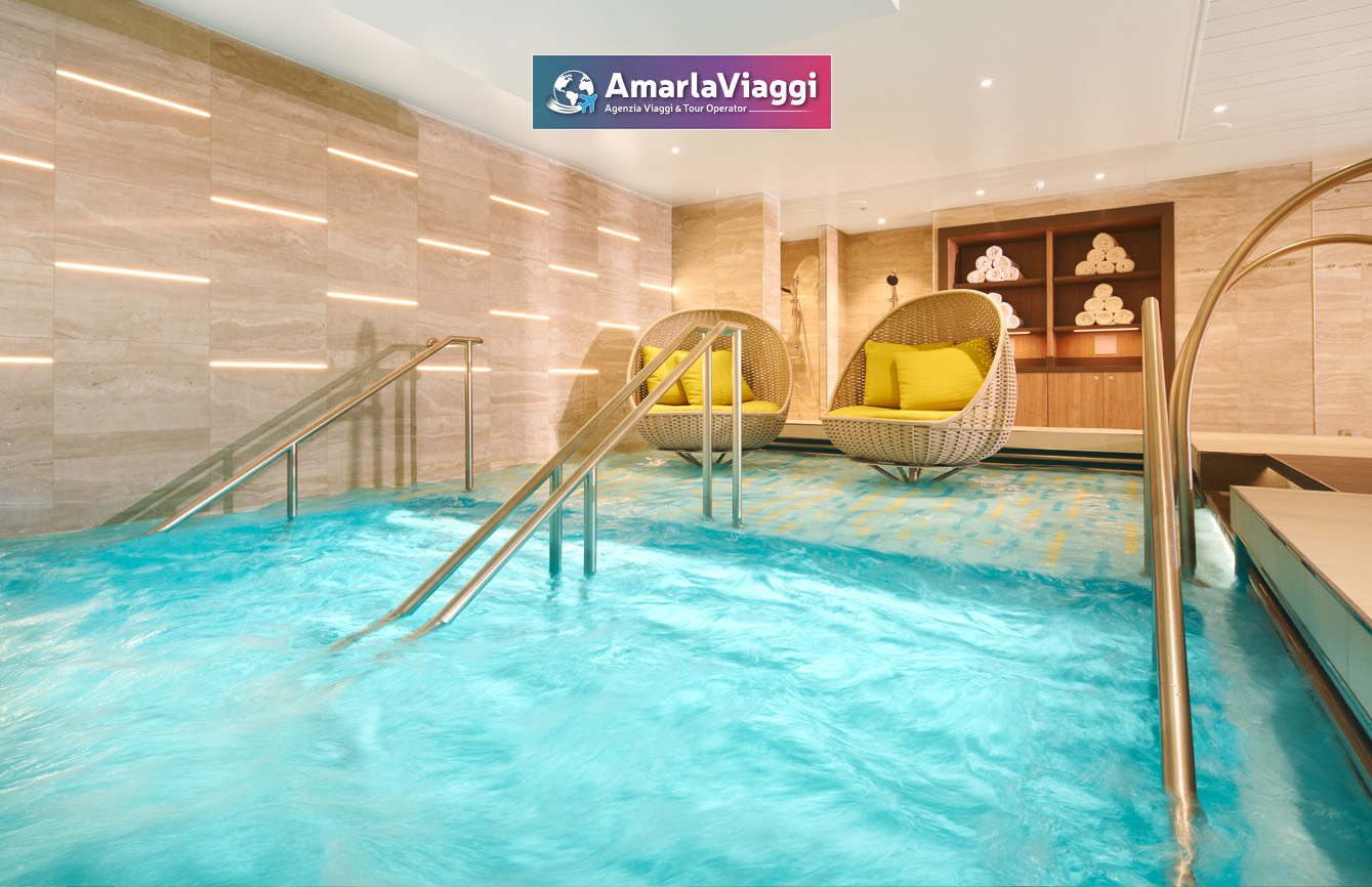A bordo, i servizi sorprendono per varietà. Tredici piscine e idromassaggi accolgono chi cerca relax e divertimento. Undici ristoranti propongono un viaggio gastronomico che spazia dalle specialità italiane ai sapori internazionali. Diciannove bar e lounge offrono atmosfere diverse, perfette per ogni momento della giornata. Non mancano una spa all’avanguardia, una palestra moderna e spazi dedicati all’intrattenimento. Scivoli e giochi d’acqua rendono felici anche i più piccoli.
