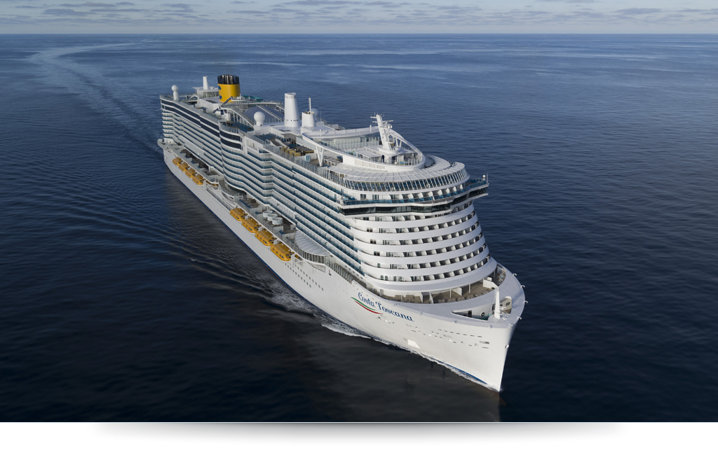 Con i suoi 337 metri di lunghezza e 42 di larghezza, Costa Toscana è imponente ma armoniosa. Può ospitare fino a 6.730 passeggeri in 2.663 cabine distribuite su 19 ponti. Ben 1.550 cabine sono dotate di balcone, per regalare ogni giorno la vista del mare. La velocità di crociera di 17 nodi garantisce spostamenti fluidi, mentre la massima di 21,5 nodi testimonia la sua potenza. Tutto è studiato per offrire comfort e sicurezza.